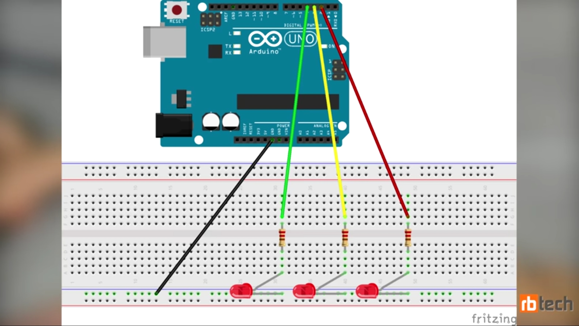- Três leds (vermelho, verde e amarelo – um de cada cor)