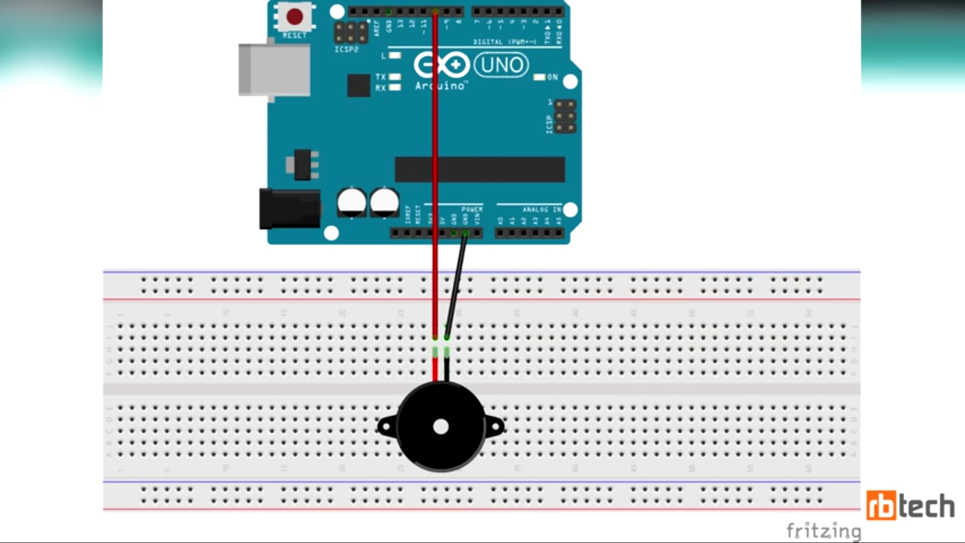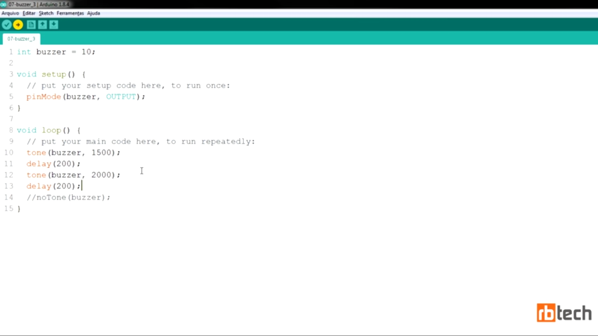Neste exemplo, recomenda-se atenção a pinagem positiva do buzzer. Empregando as funções tone e noTone.