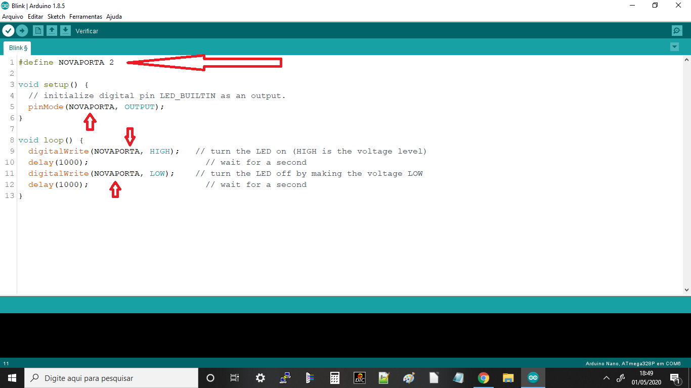 Por fim, podemos apenas verificar nosso código, sem transferir para o microcontrolador : Barra de menu > Sketch > Verificar.