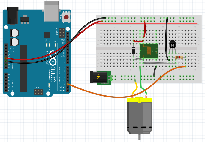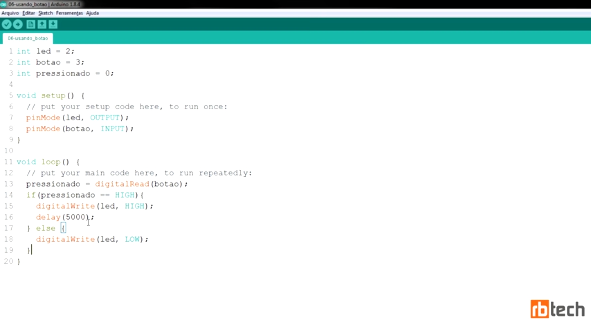 Podemos aproveitar este exemplo para acionar um motor através de um relé, protegido por um diodo. E uma pequena alteração no código original do exemplo 2, como segue abaixo.