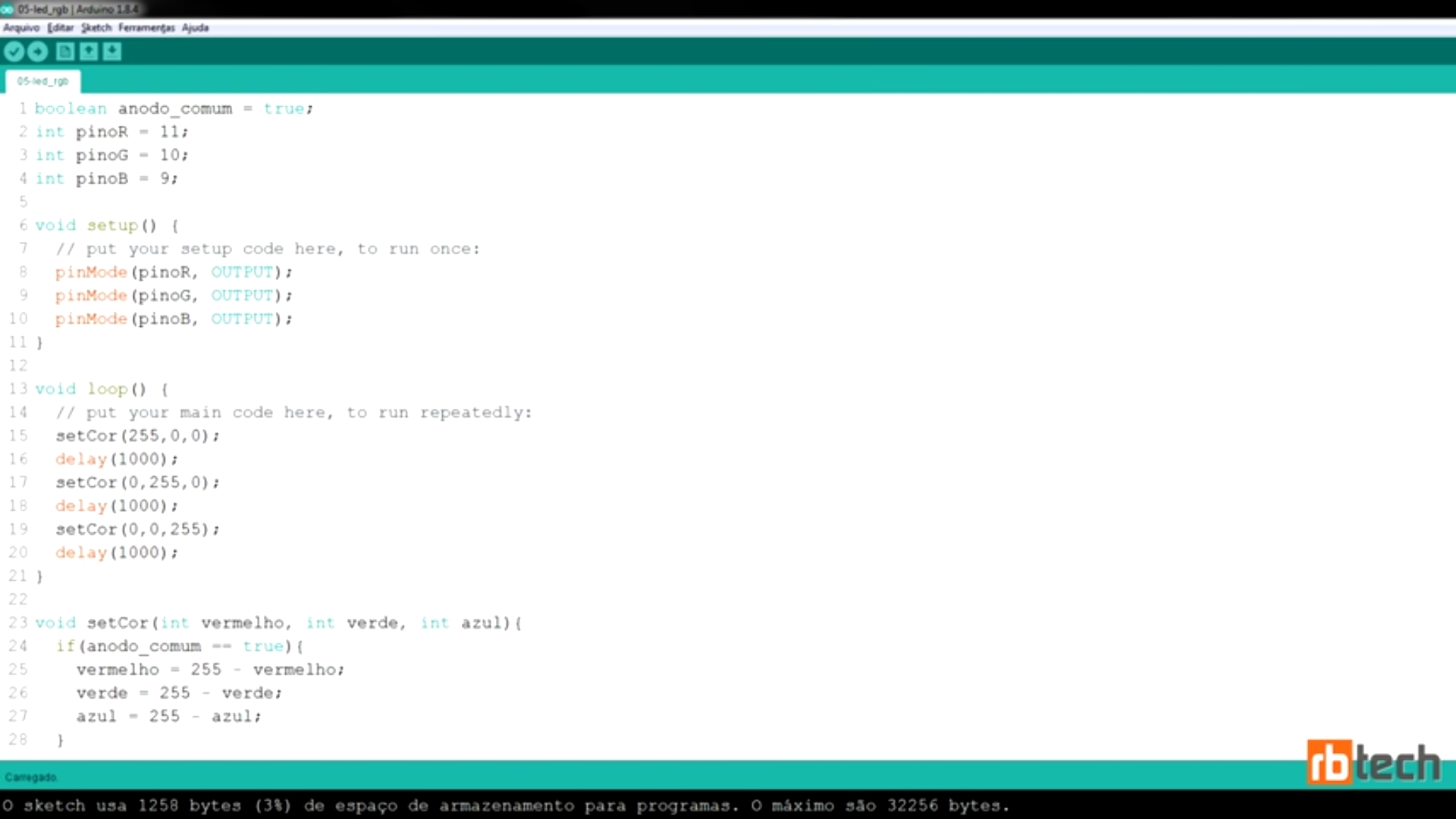 Note como uma função do desenvolvedor pode ser criada dentro do sketch – void setCor (int vermelho,int verde, int azul), que é compilado tudo junto.