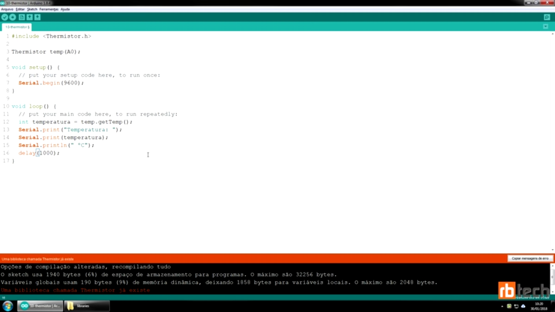 - Inclusão automática – Barra de menu > Sketch > incluir biblioteca > Termistor