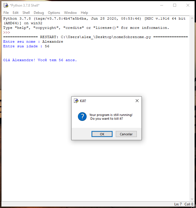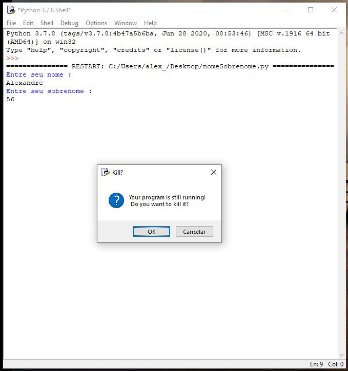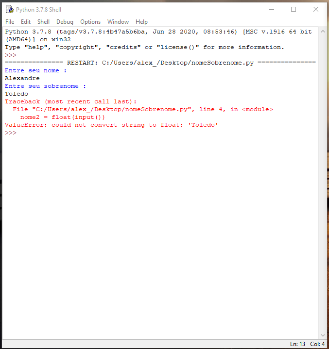 E já que começamos a conversar com o programa… Precisamos saber diferenciar o que entrar, através dos modificadores de tipo de entrada. Digite o código abaixo, execute <F5> e veja o caso abaixo: