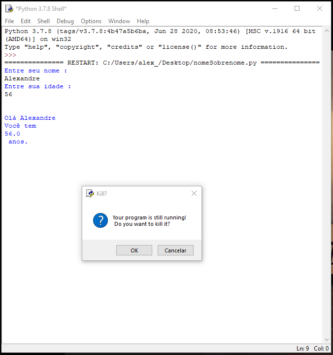 Em Python, o print não consegue concatenar uma string (Exemplo: Entre seu nome) com uma int ou um float (que são números). Percebeu que também troquei o float pelo int, né? o primeiro é para ponto flutuante, enquanto o o outro é para números inteiros, pois, afinal, contamos nossa idade de um em um ano.