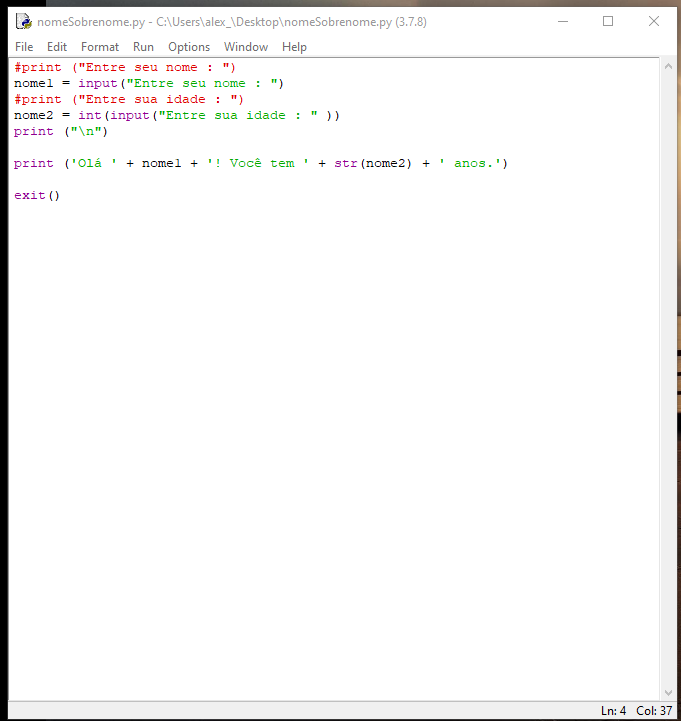 Perceba que a função input foi usada também para escrita; logo a função print foi comentada. Ela está ali, mas, como está, não será executada. Comentar uma linha que possuia um comando pode te ajudar a debugar o seu código. A vantagem é que se você precisar daquela linha que você teria apagado, ela ainda estará lá, te esperando para voltar em cena. Esse é um truque dos antigos programadores – comentar, mas, não apagar.