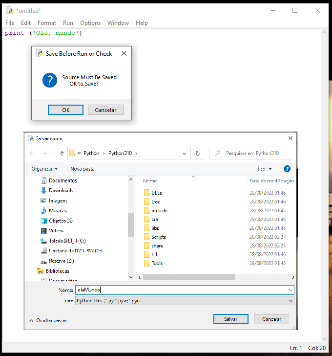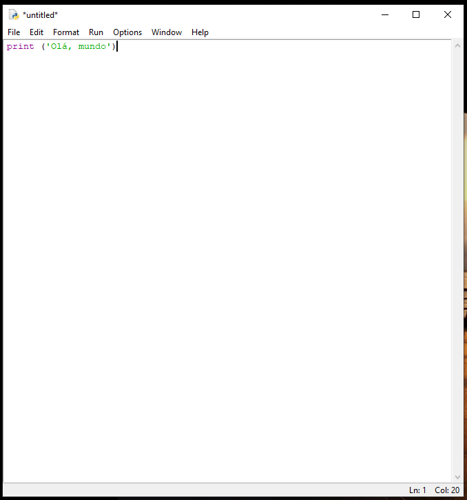 Em nossa jornada, vou passando o passo a passo de como criar o primeiro programa; o clássico “Hello, World”, logo abaixo. Iniciaremos com a função print(). Vá em File > New File. Digite print (‘Olá, mundo’), logo abaixo. Aquilo que estiver entre aspas simples será impresso, quando a execução ocorrer.