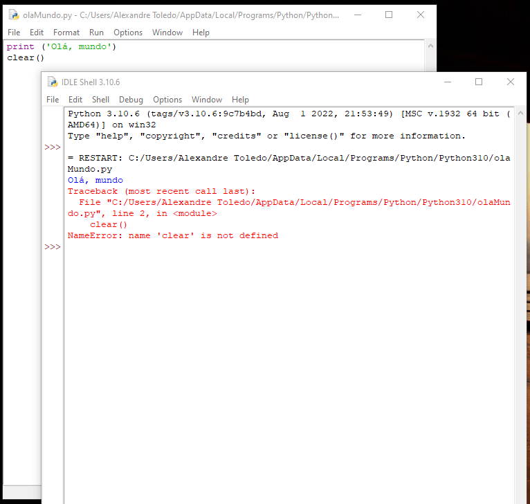 Suponhamos que você já soubesse programar e fosse usar uma instrução de outra linguagem, no nosso caso a função clear(). Como ela não existe, seu interpretador devolveria o porquê de não executar o que você digitou. Erros acontecem com muito mais frequência do que se pode imaginar. Alguns deles são: comandos inexistentes, erro de sintaxe, erro de lógica… então, se o interpretador não te entender, ele vai chiar!