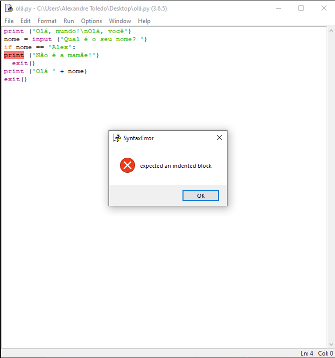 Lembra da indentação falada no início? Por termos recuado o comando print para a mesma coluna do if, o interpretador de comando não reconhece o problema e acusa erro. Ele até sabe que tem algum erro, mas, não é capaz de consertá-lo sozinho. A indentação pode ser um único espaço, ou até mesmo a tecla <TAB> pressionada uma ou mais vezes. O que interessa é que tudo aquilo que você queira que seja executado como um bloco, se a função if for satisfeita, todos os comandos/funções estejam na mesma coluna.