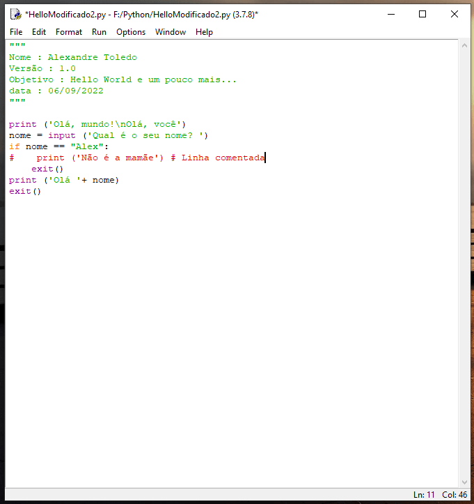 Perceba que após os dois pontos ‘:’ depois do if, foram inseridas duas funções abaixo: uma print e outra exit; e, logo em seguida outro print e outro exit, sem deslocamento.