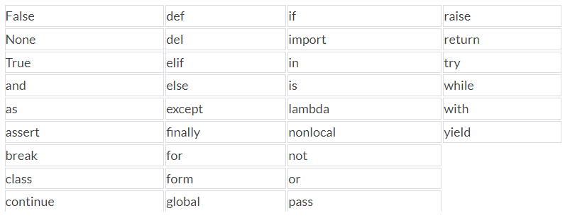 À propósito: variável em Python é chamada de identifier; e palavras reservadas são chamadas de keywords. No Python 2 existiam 30 keywords, enquanto que no Python há 33, como segue abaixo: