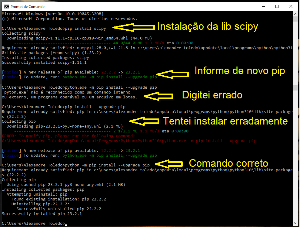 Acompanhe o que aconteceu comigo, durante a instalação e evite os mesmos erros que cometi. O instalador avisou-me que havia uma atualização do próprio pip.